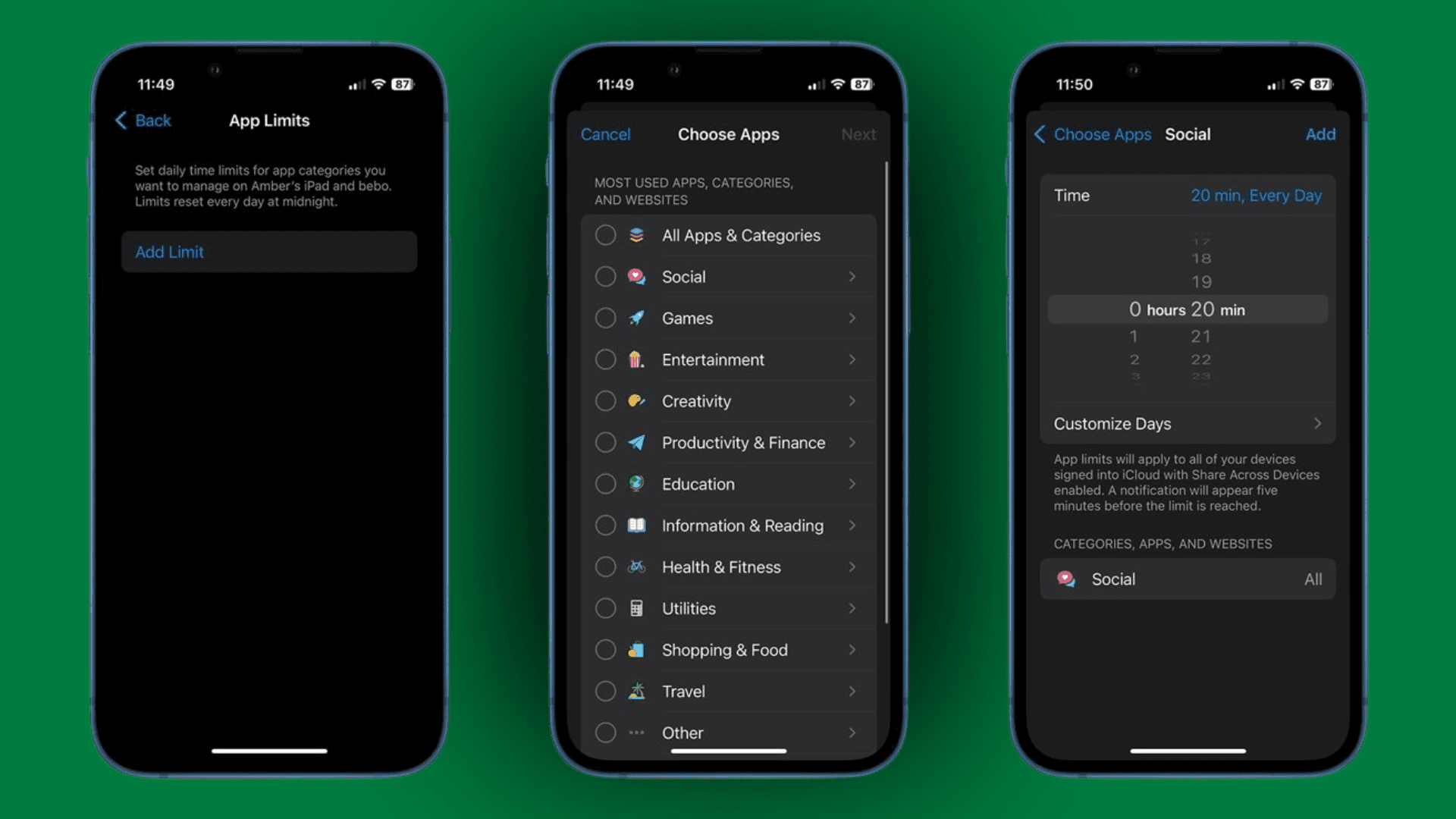 Choose a category (Social, Games, Entertainment) → set time limit → tap Add.