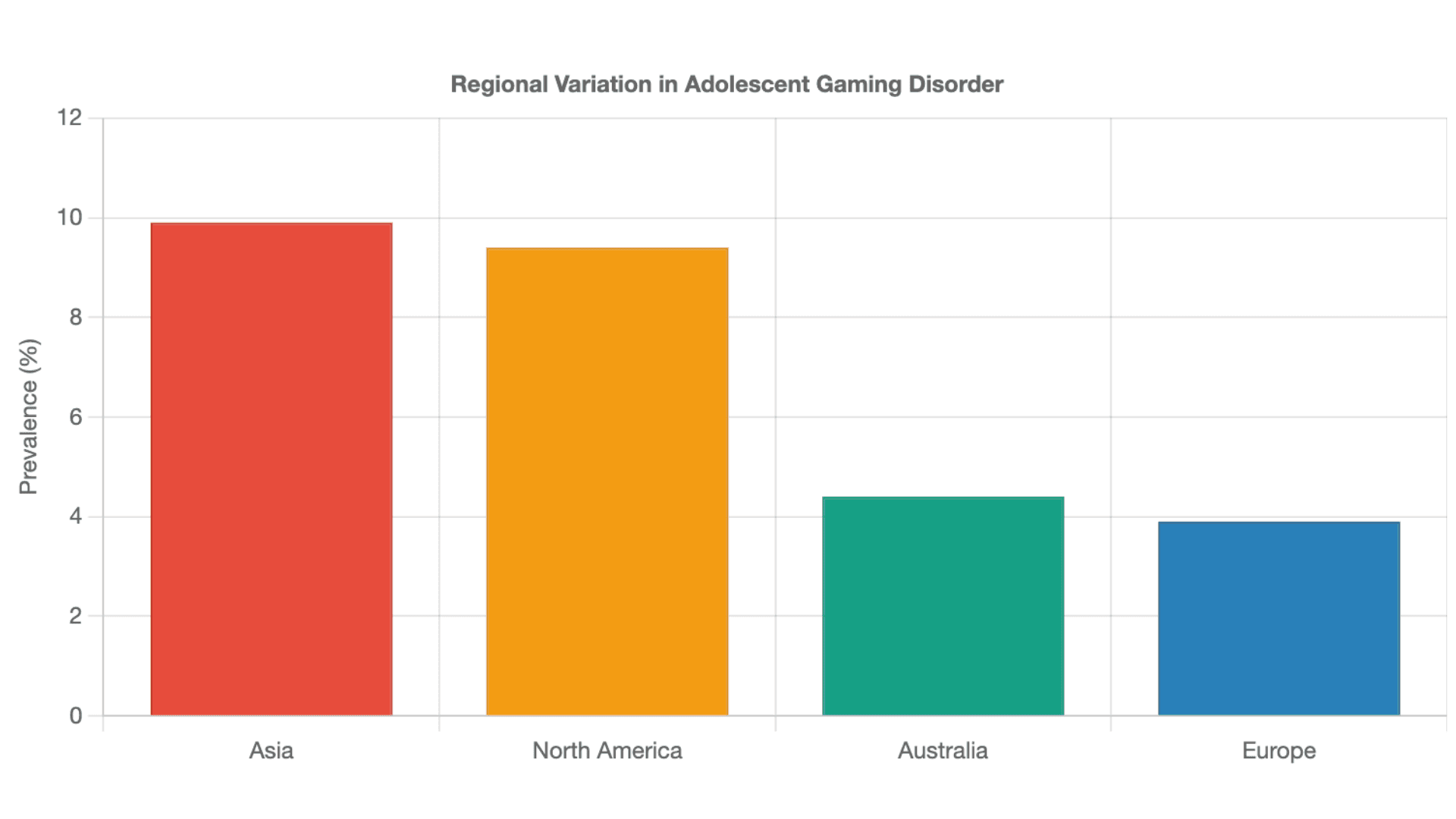 Global statistics show gaming disorder affects about 8% of adolescents worldwide, with significant regional variation: Asian countries report 9.9%, North America 9.4%, Australia 4.4%, and Europe 3.9%.